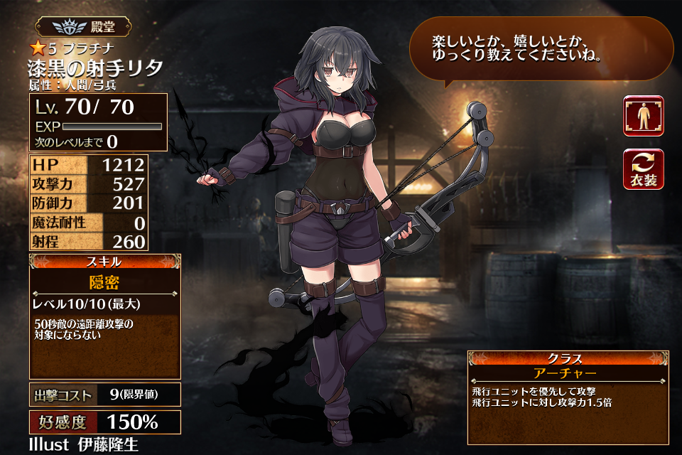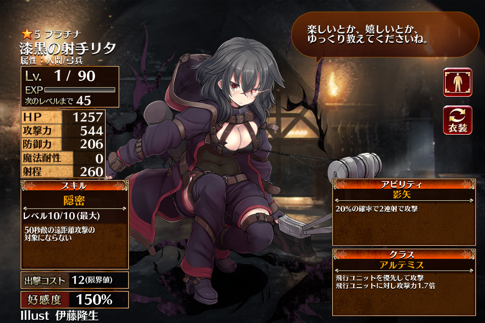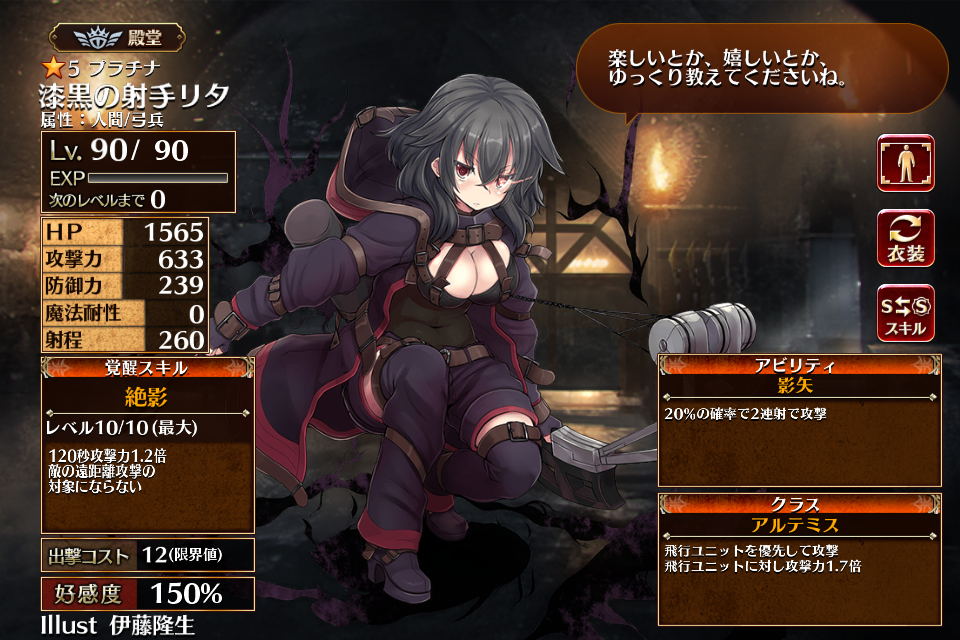 | プ ラ チ ナ | ![]() 漆黒の射手リタ | アーチャー | Lv5 | 934 | 274 | 96 | 0 | 260 | 14 | 9 | 攻撃力+144 防御力+72 攻撃硬直-14% | 隠密 | - | 編 集 |