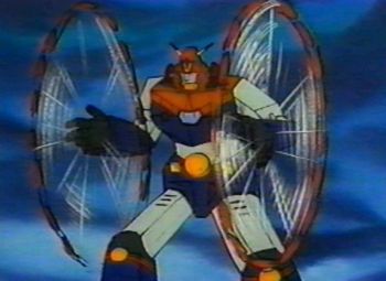 頭部から発する電磁竜巻を腕に移し、相手に叩きつけて動きを封じる。超電磁スピンへのつなぎの技。![]() ![]() 写真 超電磁ロボコン・バトラーV(1976) オープニングより |