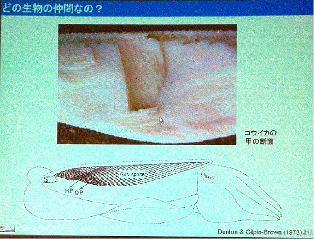 この甲は舟のような格好をしていてアンモナイトとは異なるが、トグロコウイカでは体の中にアンモナイトの様にぐるりとなっている。薄い筋として見えているのが隔壁。トグロコウイカは熱帯の海に生きている。