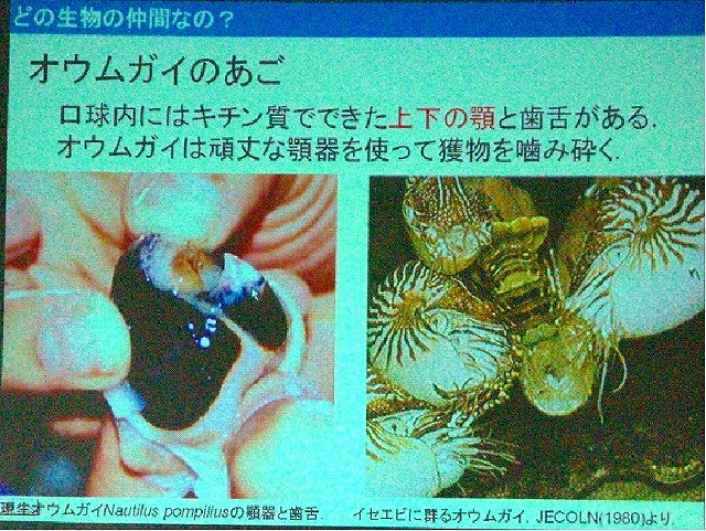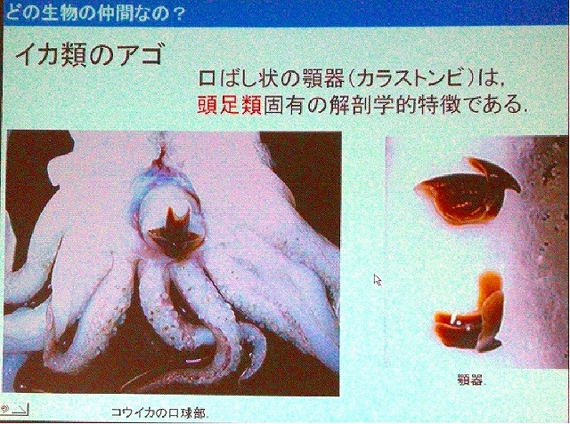 ↑オームガイやイカの仲間を頭足類と言う。このグループの特徴はカラストンビと言われるくちばし状のアゴがある。カラストンビはキチン質といわれる堅いタンパク質から出来ている。