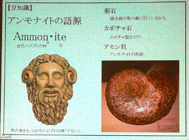 ↑アンモナイトは二つの英語で出来ていて、最初のAmmonはエジプトの神様の名前で、耳の所がヒツジの角のような形をしている。 iteは石と言う意味。