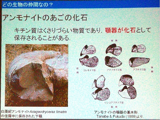 アンモナイトは今生きているオウムガイと殻のつくりが似ていて、顎器(カラストンビ)も化石として見つかっている。