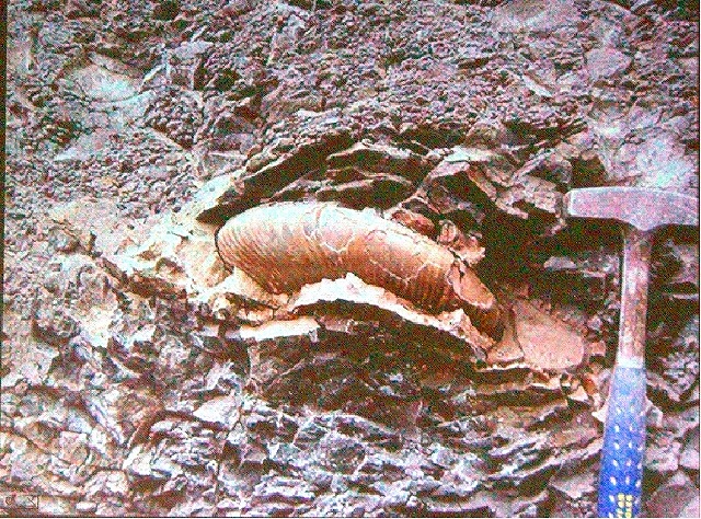 ↑北海道で地層にアンモナイトが埋まっている様子。