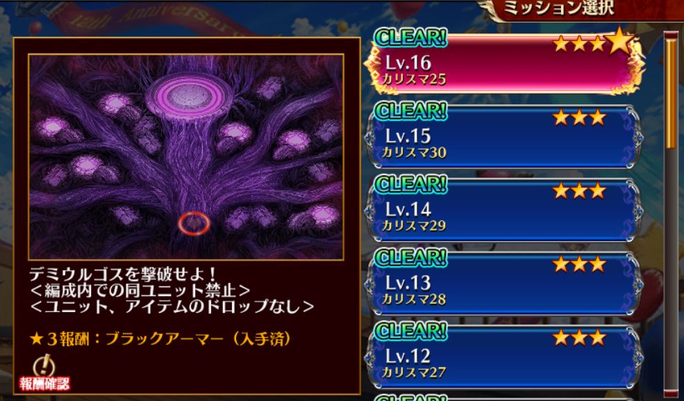 ズィズィー、ロゼルヌがいないが、前回よりそれなりに戦力アップしてるのでデミウルゴスLv16☆3やってみた。