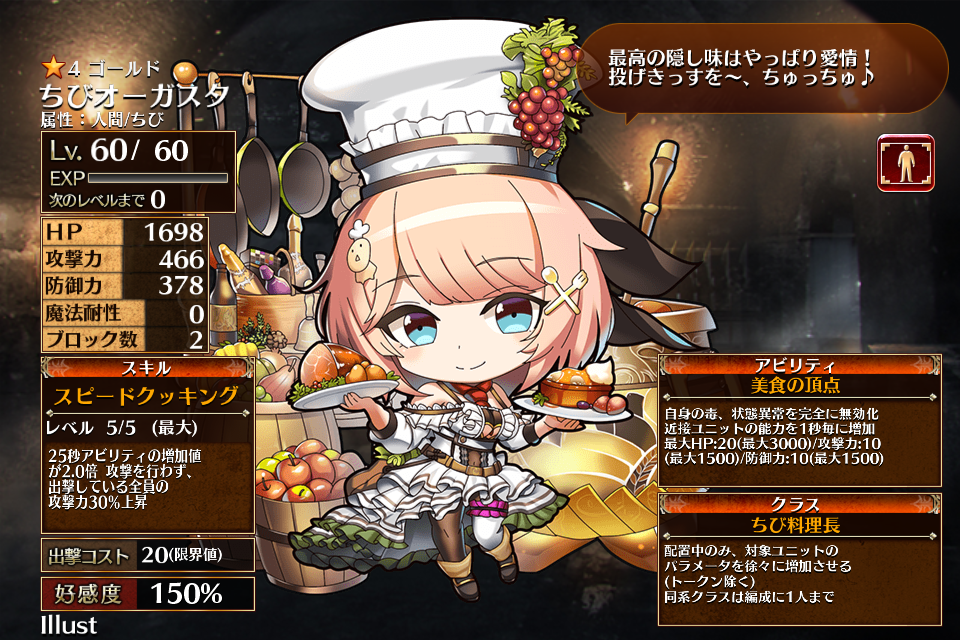 | スピードクッキング | Lv1 | 20秒アビリティの増加値が2.0倍 攻撃を行わず、出撃している全員の攻撃力30%上昇 | 銀 | 56 | 青 | 白 | 黒 | 84 | ちびオーガスタ | 編 集 |