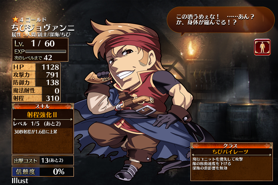 | 射程強化II | Lv1 | 30秒射程が1.6倍に上昇 | 34 | 23 | - | 17 | - | 34 | 弓兵ソーマ 海賊ジョヴァンニ 魔女メローネ 見習い海巫女リバン ちびソーマ ちびメーリス ちびメル 狩人ベラ 狂聖女フェドラ 見習い魔術師メーリス 復讐者ヴィンセント ハーフエルフのユユ 砲術士メル 白き魔女ベリンダ ちびヴィンセント ちびジョヴァンニ | 編 集 |