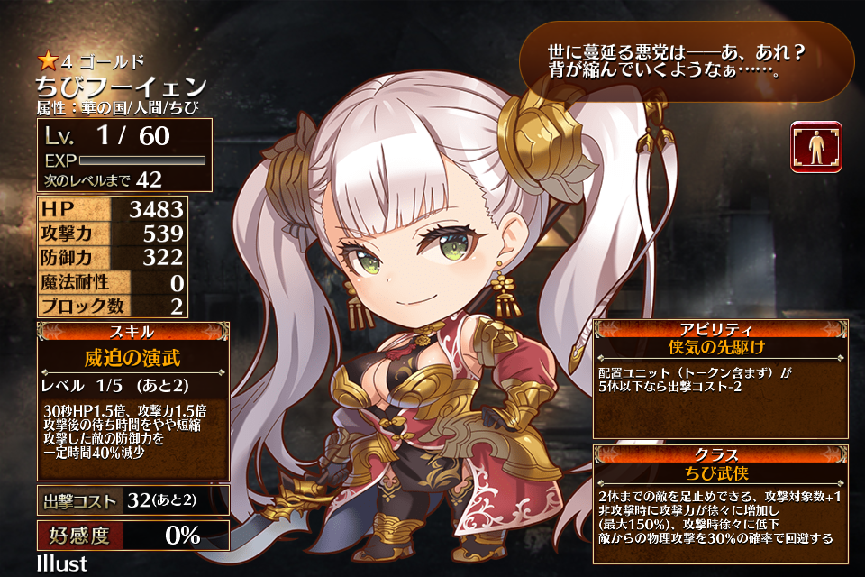 | 威迫の演武 | Lv1 | 30秒HP1.5倍、攻撃力1.5倍 攻撃後の待ち時間をやや短縮 攻撃した敵の防御力を一定時間40%減少 | 銀 | 29 | 青 | 24 | 黒 | 44 | 豪放遊侠フーイェン ちびフーイェン | 編 集 |