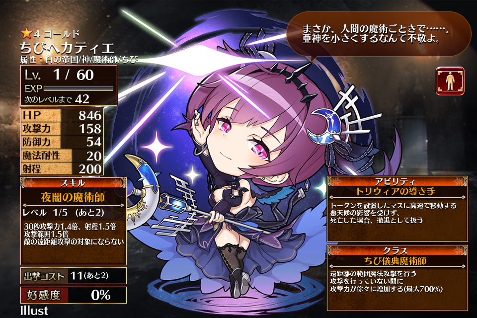 | 夜闇の魔術師 | Lv1 | 30秒攻撃力1.4倍、射程1.5倍 攻撃範囲1.5倍 敵の遠距離攻撃の対象にならない | 銀 | 32 | 青 | 白 | 黒 | 49 | ちびヘカティエ | 編 集 |