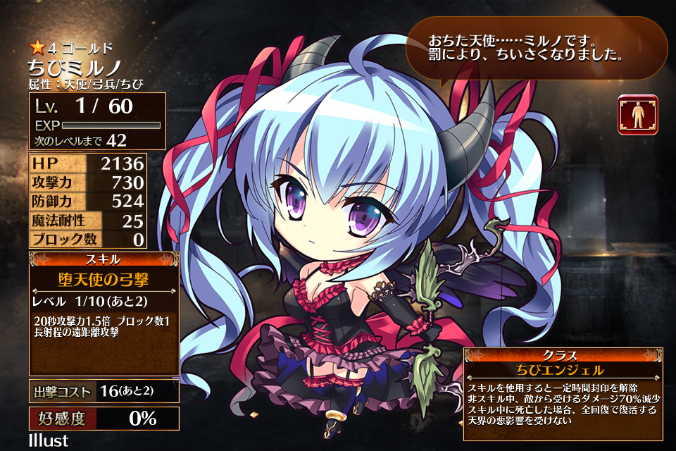 | 堕天使の弓撃 | Lv1 | 20秒攻撃力1.5倍 ブロック数1 長射程の遠距離攻撃 | - | 16 | - | 12 | - | 23 | 天使長ミルノ ちびミルノ | 編 集 |