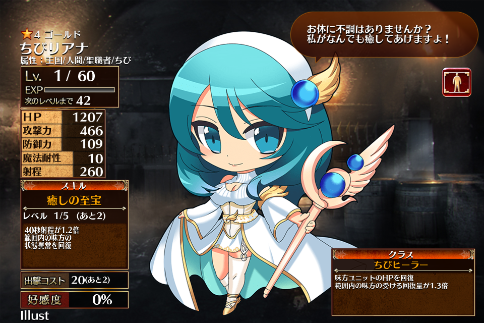 至宝の使い手リアナのちびバージョンで、同名ユニットに合成するとコスト経験値8・スキル経験値12を獲得できる。