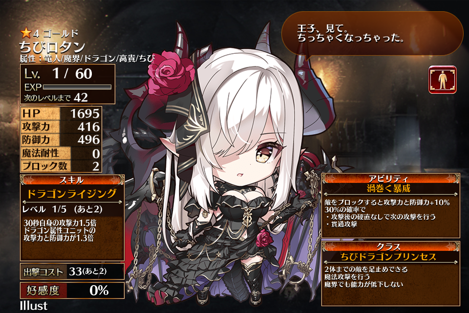 | ゴ | ル ド | ![]() ちびロタン | ちび ドラゴンプリンセス | Lv1 | 1695 | 416 | 496 | 0 | 2 | 33 | 30 | HP+330 防御力+66 攻撃力+50 | ドラゴンライジング | 渦巻く暴威 | 編 集 |