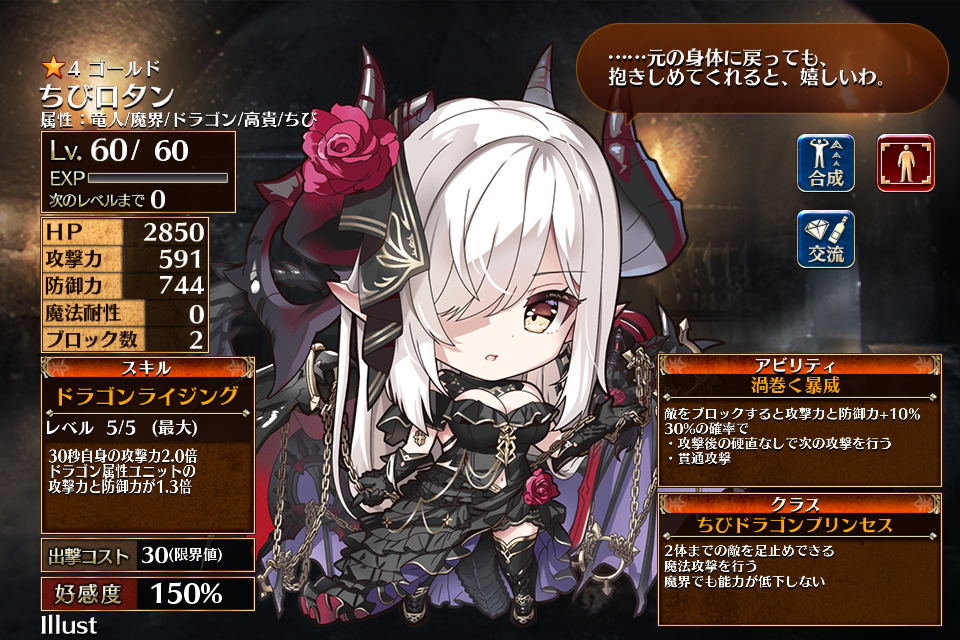 | ドラゴンライジング | Lv1 | 30秒自身の攻撃力1.5倍 ドラゴン属性ユニットの攻撃力と防御力が1.3倍 | - | 42 | - | - | 1 | 64 | 原初の竜姫ロタン ちびロタン | 編 集 |