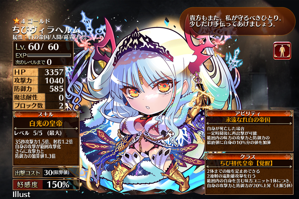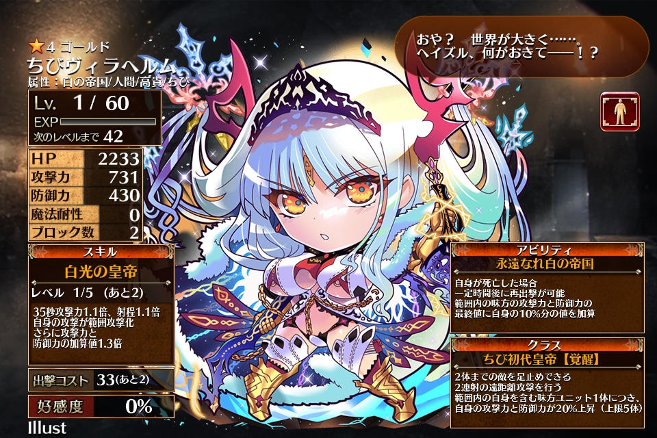 | 白光の皇帝 | Lv1 | 35秒攻撃力1.1倍、射程1.1倍 自身の攻撃が範囲攻撃化 さらに攻撃力と防御力の加算値1.3倍 | 銀 | 35 | 青 | 白 | 黒 | 54 | ちびヴィラヘルム | 編 集 |