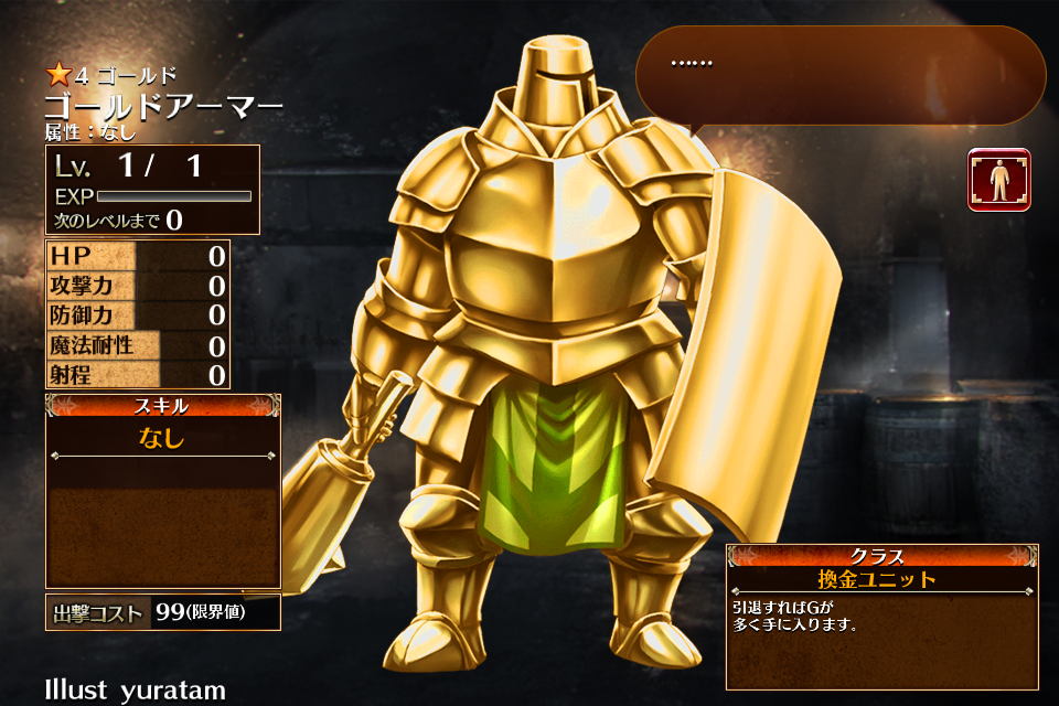 見た目はヘビーアーマーだが、戦闘用ユニットとしては使えず(そもそも全能力値0)、合成や覚醒等の素材にもならない*1。