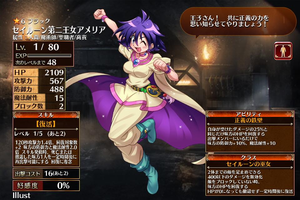 | ブ ラ ッ ク | ![]() セイルーン第二王女 アメリア | セイルーンの巫女 | Lv1 | 2109 | 567 | 488 | 15 | 2 | 16 | 13 | ??+?? ??+?? | 【復活】 | 正義の鉄壁 | 編 集 |