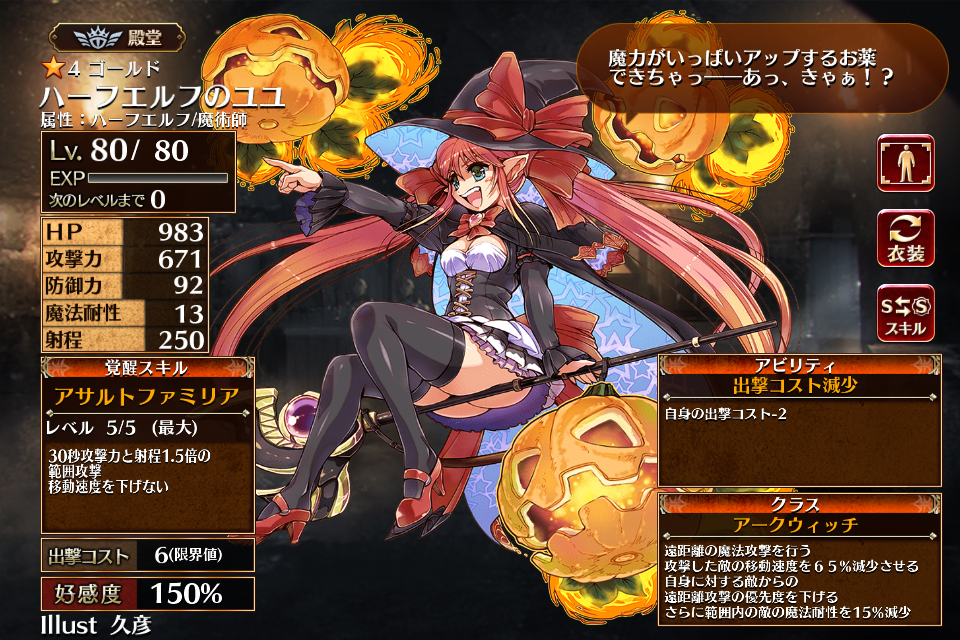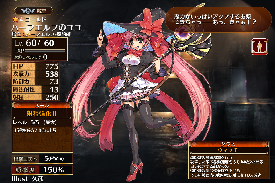 | ゴ | ル ド | ![]() ハーフエルフの ユユ | ウィッチ | Lv1 | 625 | 283 | 50 | 13 | 250 | 8 | 5 | 攻撃力+132 攻撃硬直-13% | 射程強化II | - | 編 集 |
