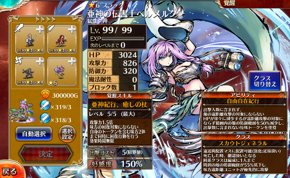| スカウトオフィサー | Lv1 | 1588 | 463 | 206 | 0 | 1 | 8 | 5 | HP+648 攻撃力+134 攻撃力+90 | 痛み届ける伝書士 ↓ ↑ 亜神紀行、癒しの杖 | 自由自在紀行 | |||