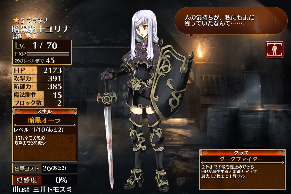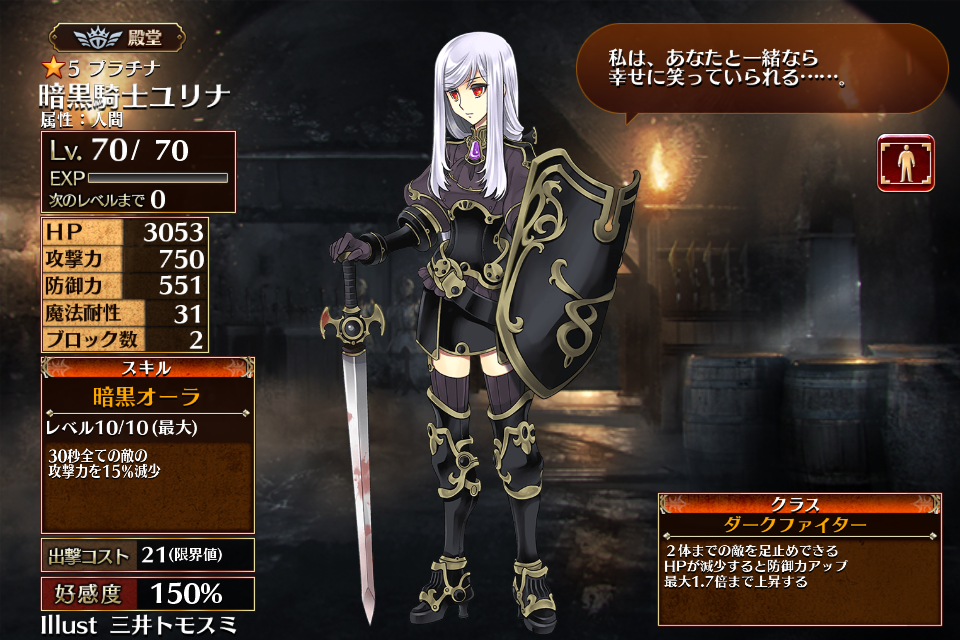 (叛逆の騎士コーネリアは別格として)ダークファイターの中では防御に特化しており、第二覚醒まで成長させれば高い壁性能を発揮する。
