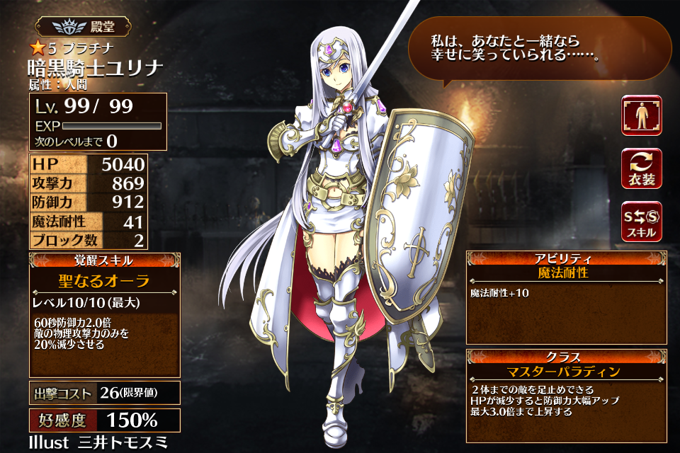 好感度上限解放150%の補正も合わせると魔法耐性41、魔法受けの近接ユニットとしても高性能な部類。