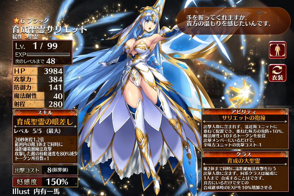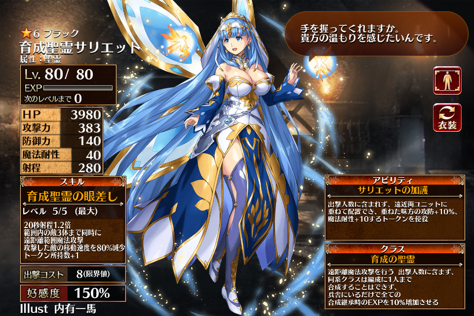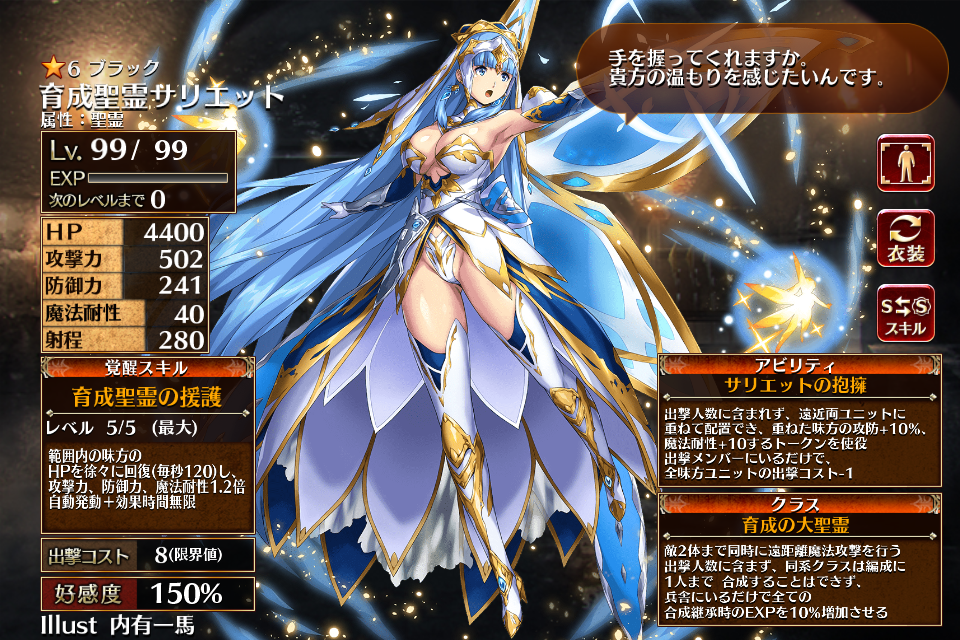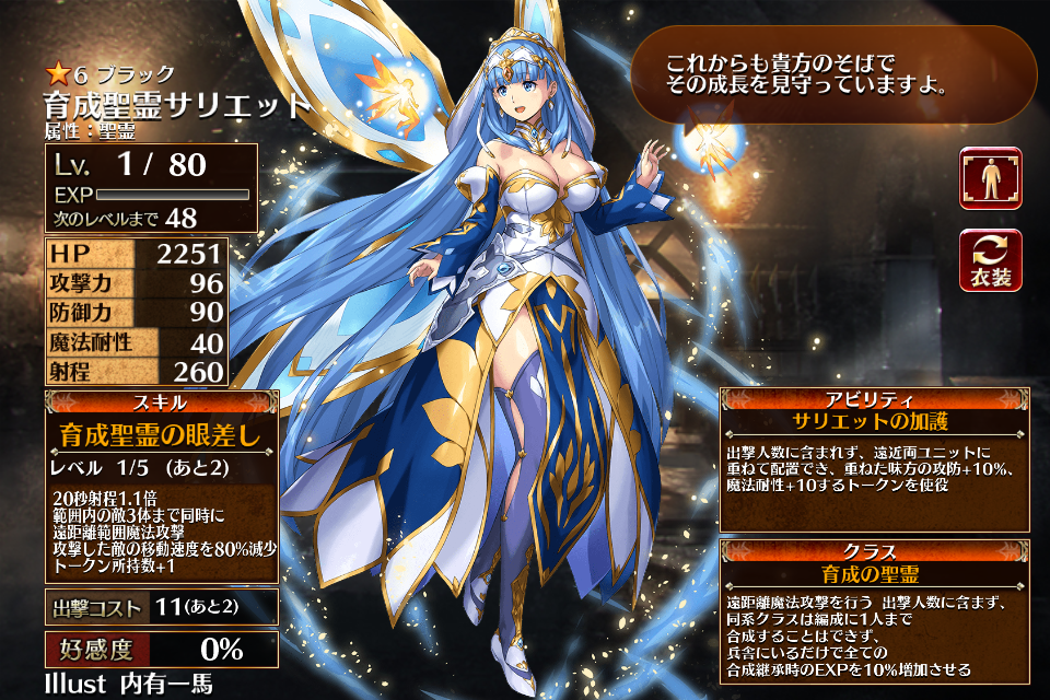 | 育成の大聖霊 | Lv1 | 3084 | 294 | 141 | 40 | 260 | 11 | 8 | HP+900 攻撃力+90 射程+20 | 育成聖霊の眼差し ↓ ↑ 育成聖霊の援護 | サリエットの抱擁 | |||