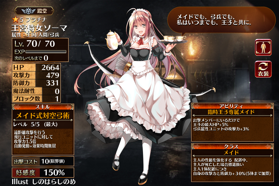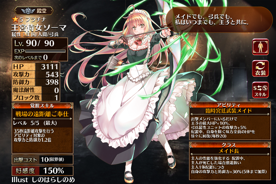 アビリティ「臨時王子専属メイド」により、王子には最大HP+5%、弓兵属性ユニットには攻撃力+3%の編成バフを与える。