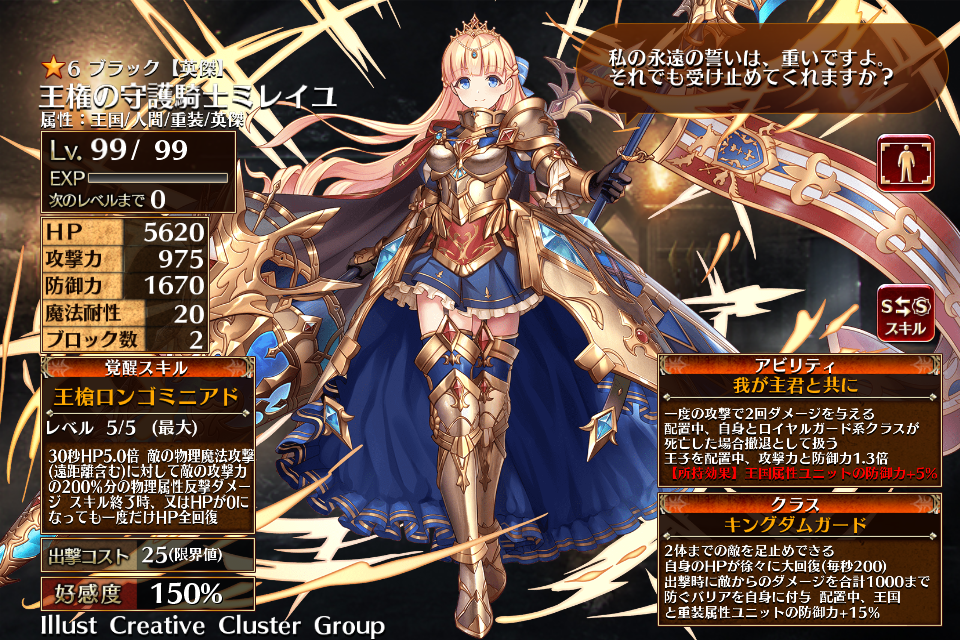 | 叙事詩に残る騎士 | Lv1 | 効 | 銀 | 金 | 青 | 白 | 1 | 39 | 王権の守護騎士ミレイユ | 編 集 |