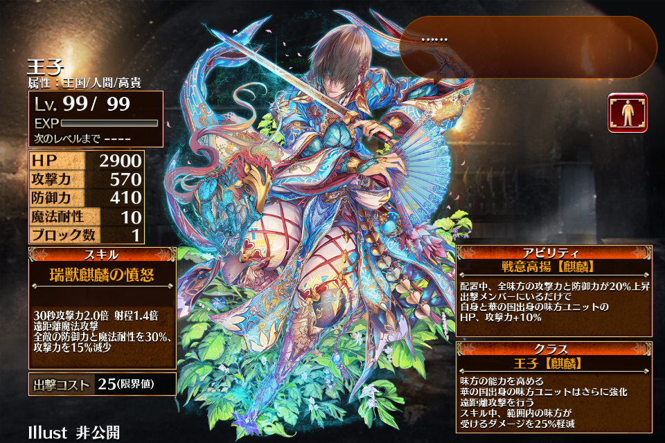 - 出撃メンバーにいるだけで自身と華の国出身の味方ユニットのHP、攻撃力+10%