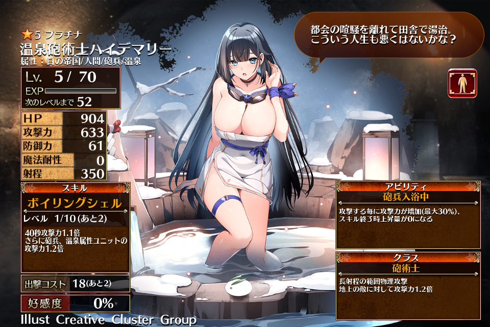 | プ ラ チ ナ | ![]() 温泉砲術士 ハイデマリー | 砲術士 | Lv5 | 904 | 633 | 61 | 0 | 350 | 18 | 13 | 攻撃力+144 防御力+72 HP+360 | ボイリングシェル | 砲兵入浴中 | 編 集 |