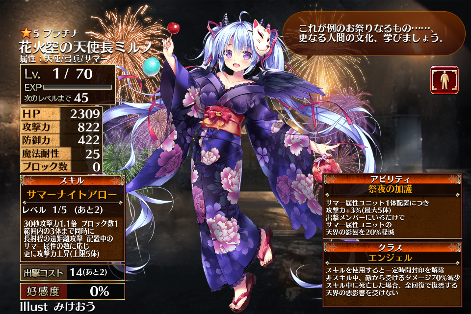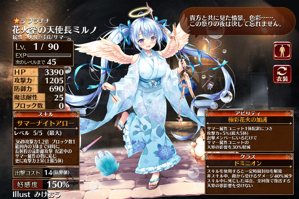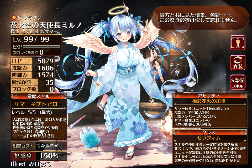 2023/08/24に浴衣プレミアム召喚限定ユニットとして実装されたレアリティプラチナのエンジェル。