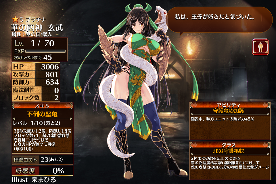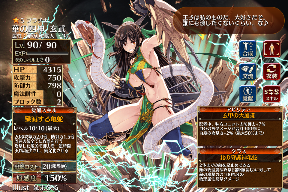 | プ ラ チ ナ | ![]() 華の四神 玄武 | 北の守護亀蛇 | Lv1 | 3006 | 801 | 634 | 0 | 2 | 23 | 20 | HP+360 攻撃力+144 攻撃力+72 | 不倒の堅亀 | 守護亀の加護 | 編 集 |