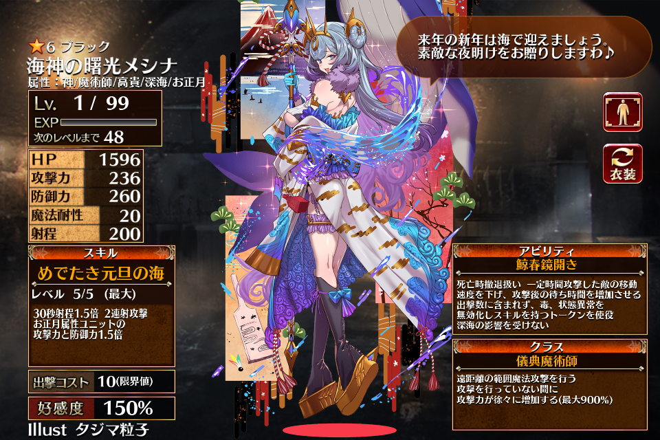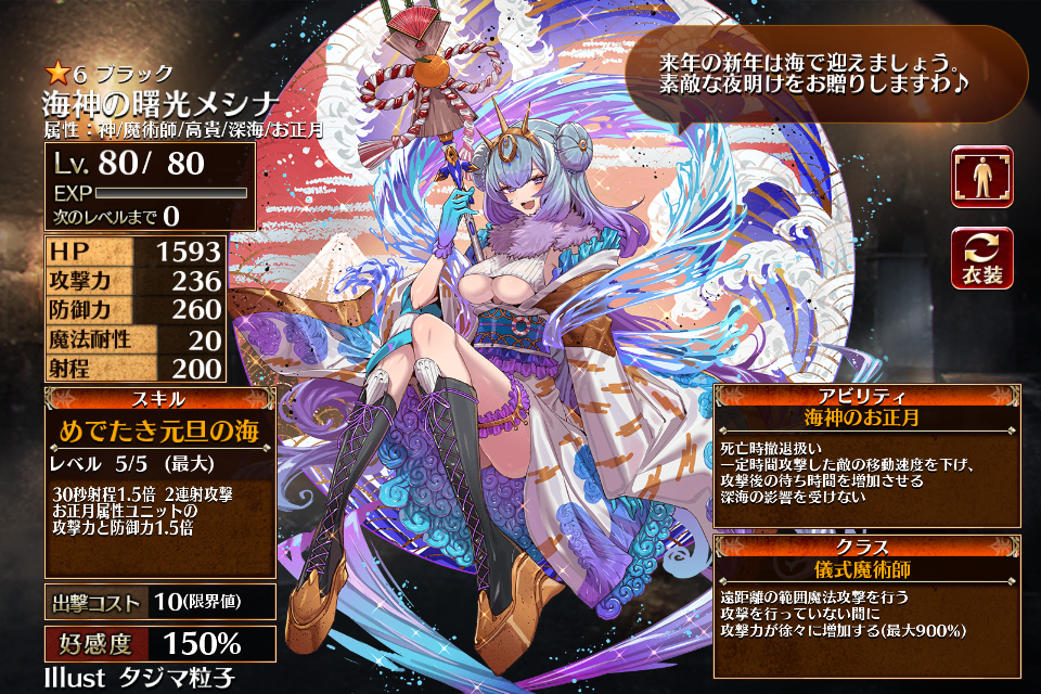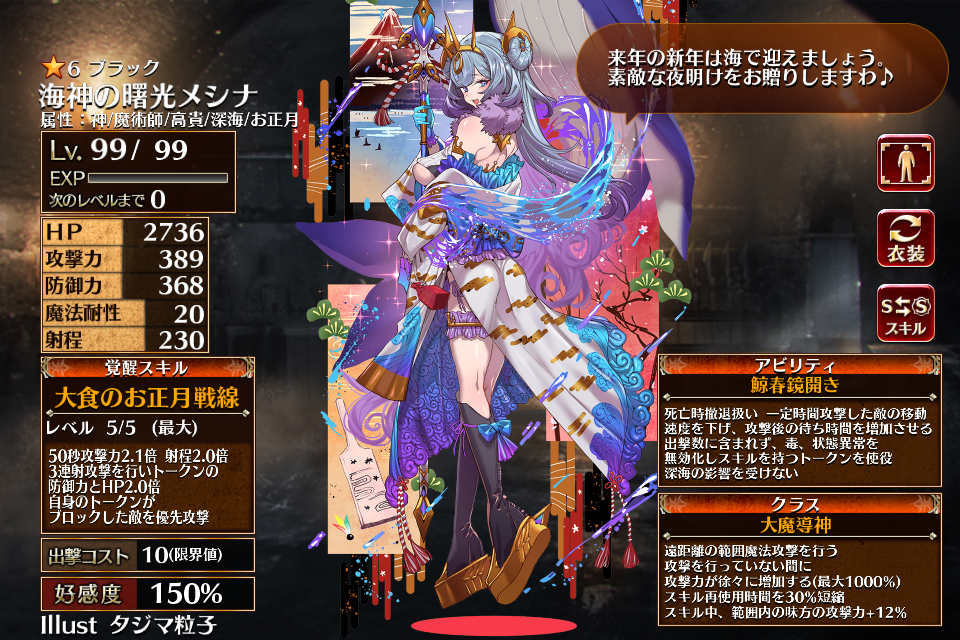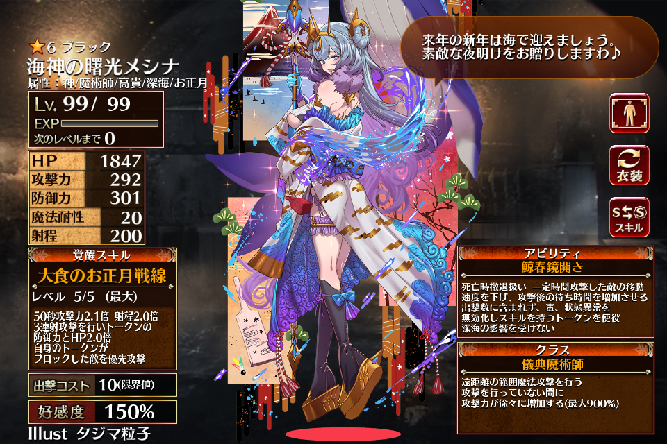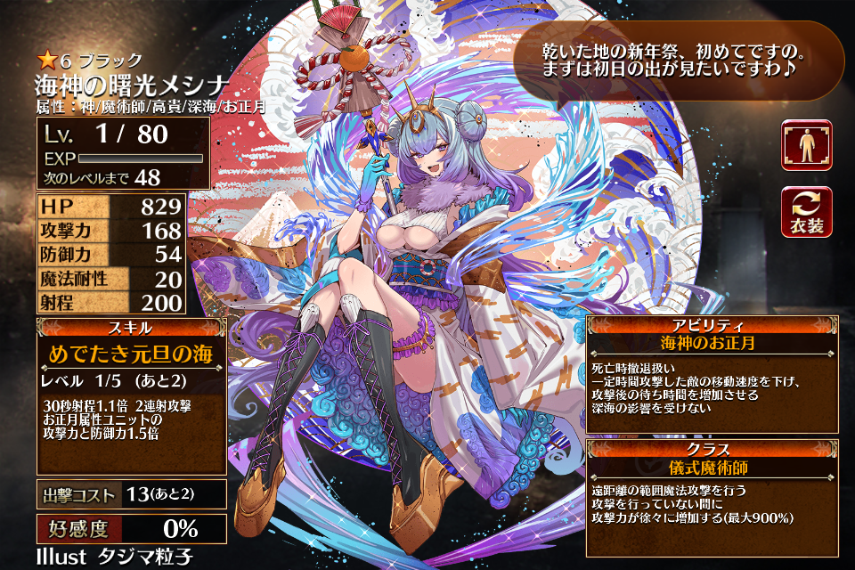 | 儀典魔術師 | Lv1 | 1146 | 236 | 80 | 20 | 200 | 13 | 10 | HP+450 防御力+180 スキル再使用時間-25% | めでたき元旦の海 ↓ ↑ 大食のお正月戦線 | 鯨春鏡開き | |||