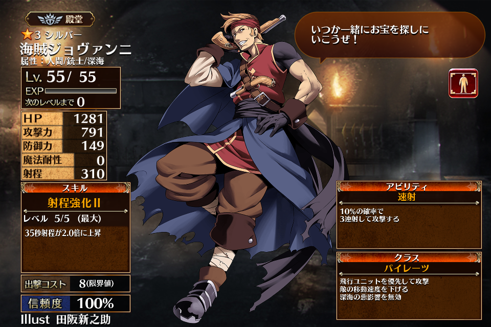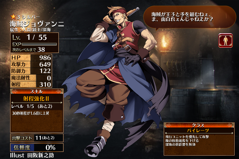 基礎性能上は同じシルバーの海賊ヴェロッテと比較すると攻撃力が高く、HPと防御力に劣る。