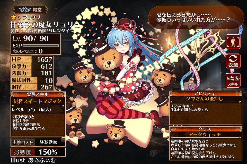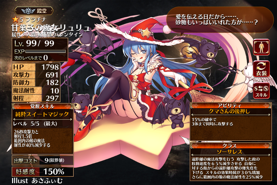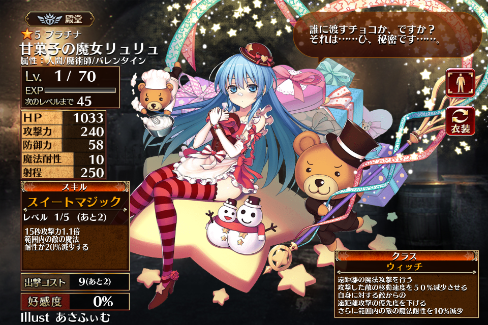 | プ ラ チ ナ | ![]() 甘菓子の魔女 リュリュ | ウィッチ | Lv1 | 1033 | 240 | 58 | 10 | 250 | 9 | 6 | 攻撃力+144 防御力+72 射程+17 | スイートマジック | - | 編 集 |