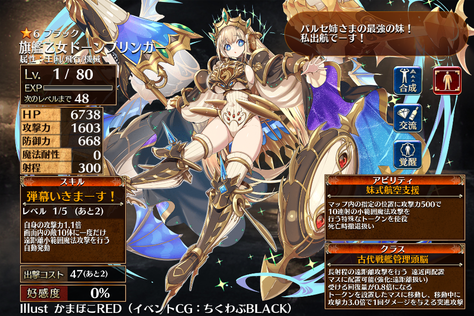 | ブ ラ ッ ク | ![]() 旗艦乙女 ドーンブリンガー | 古代戦艦管理頭脳 | Lv1 | H | 攻 | 防 | 魔 | ブ | 初 | 下 | ??+?? ??+?? ??+?? | 弾幕いきまーす! | 妹式航空支援 | 編 集 |