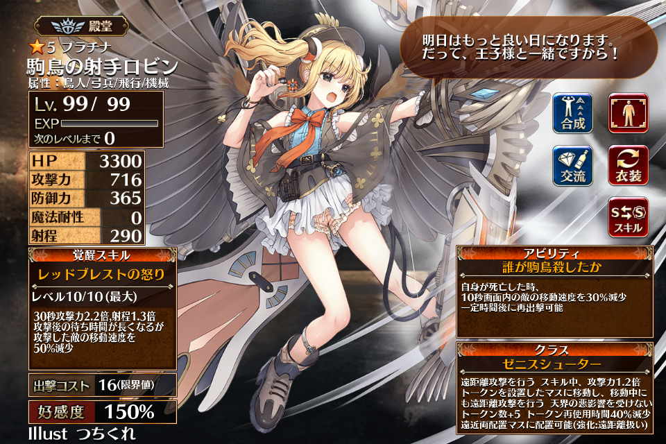 | 通常 | 駒鳥の囀り | 20秒攻撃力1.6倍 非移動時、攻撃対象数+2 敵に止めを刺さない 自動発動 | 初動まで10秒 | 回復まで20秒 |