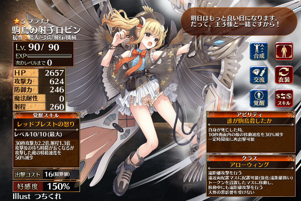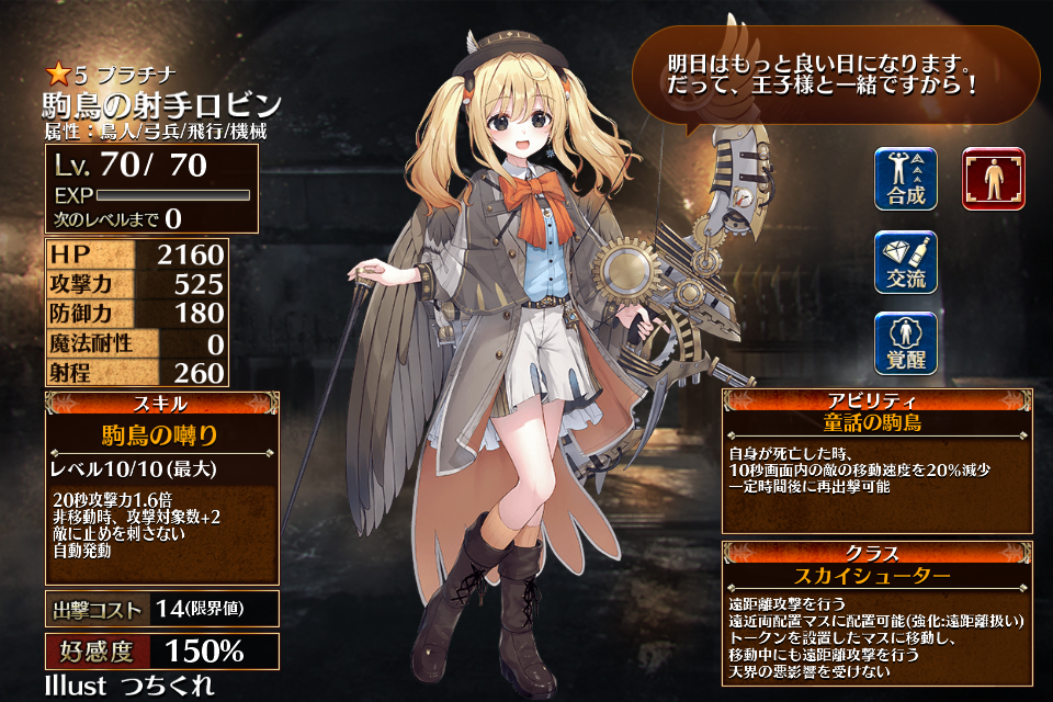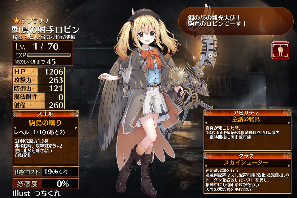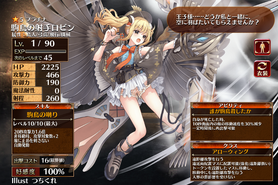 | プ ラ チ ナ | ![]() 駒鳥の射手ロビン | スカイシューター | Lv1 | 1206 | 263 | 121 | 0 | 260 | 19 | 14 | HP+540 攻撃力+108 攻撃力+72 | 駒鳥の囀り | 童話の駒鳥 | 編 集 |