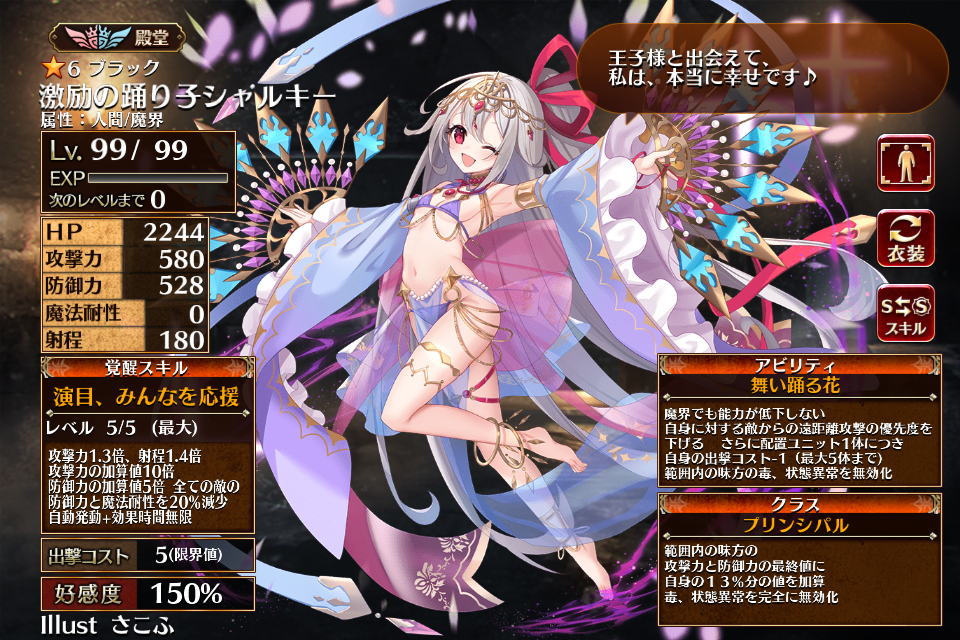 | 覚醒 | 演目、みんなを応援 | 攻撃力1.3倍、射程1.4倍 攻撃力の加算値10倍 防御力の加算値5倍 全ての敵の防御力と魔法耐性を20%減少 自動発動+効果時間無限 | 初動まで5秒 | 回復まで60秒 |