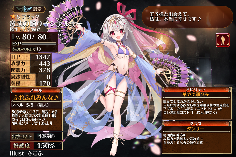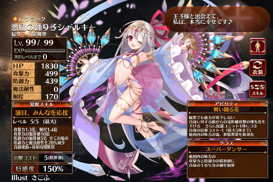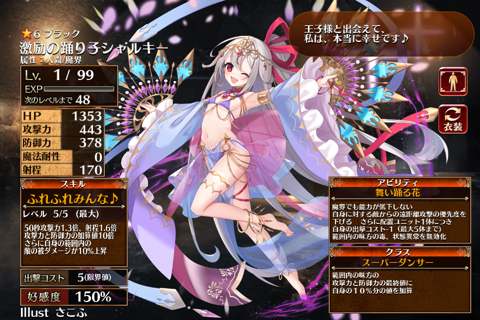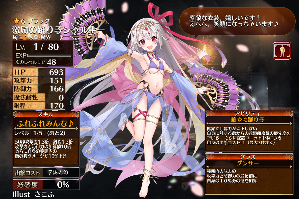 ただいま情報提供所にて情報募集中です。2024/11/14に召喚に実装されたブラックレアのダンサーで、新装ユニットとなった踊り子シャルキー。
