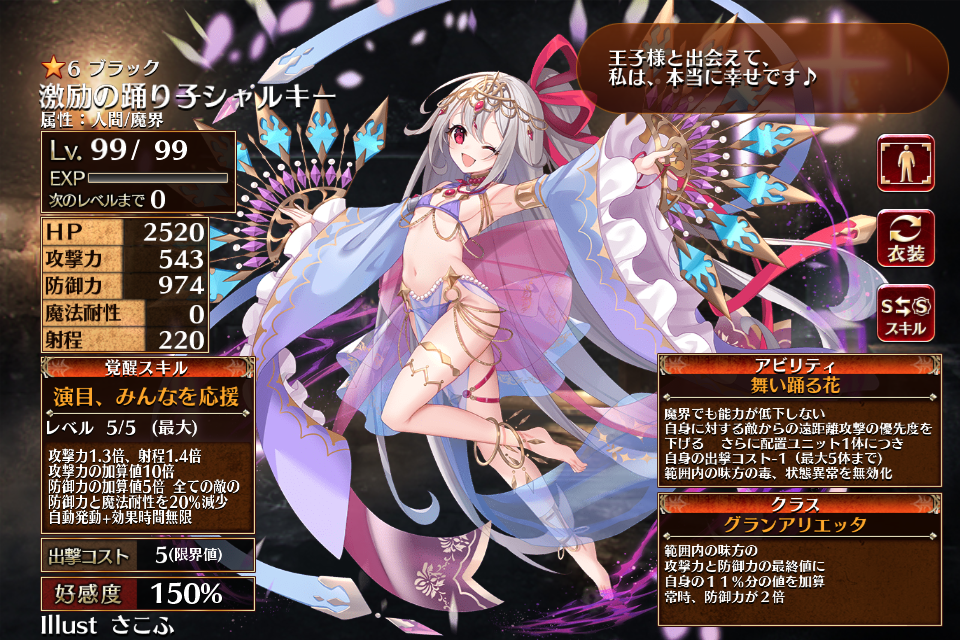 | ブ ラ ッ ク | ![]() 激励の踊り子 シャルキー | ダンサー | Lv1 | 693 | 151 | 166 | 0 | 170 | 7 | 4 | HP+450 攻撃力+180 防御力+90 | ふれふれみんな♪ | 華やぐ踊り子 | 編 集 |