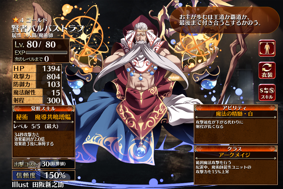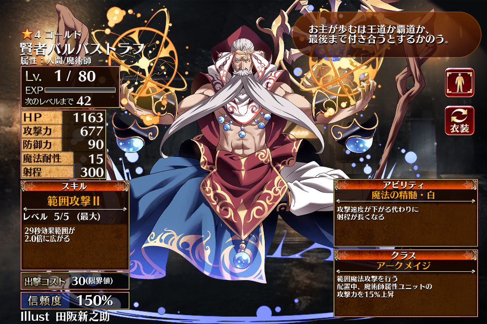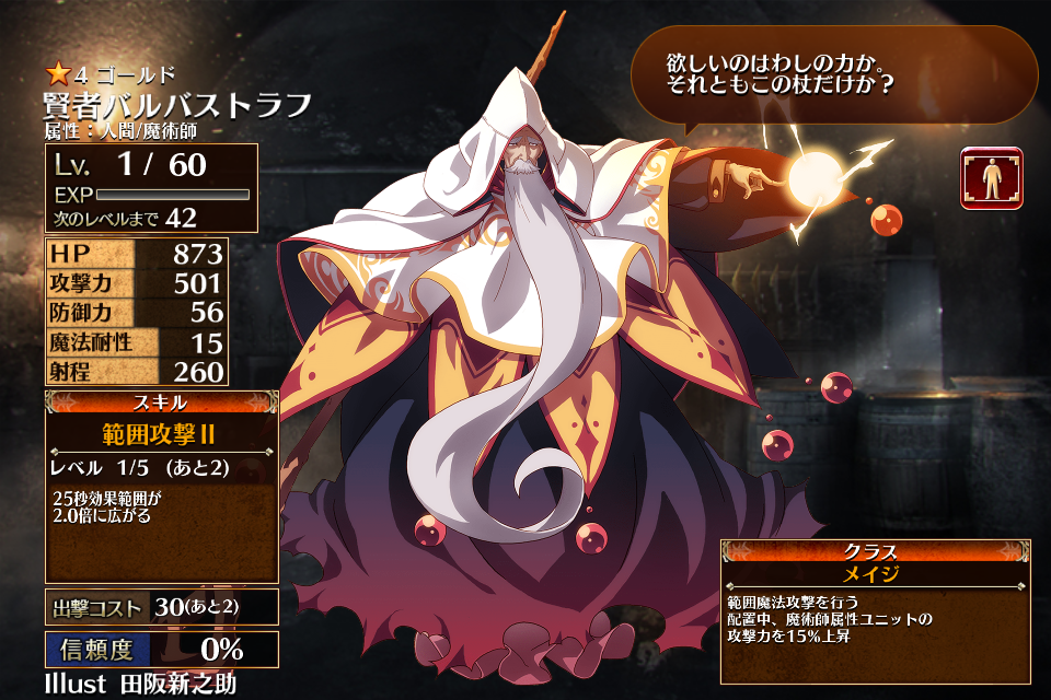 | ゴ | ル ド | ![]() 賢者 バルバストラフ | メイジ | Lv1 | 873 | 501 | 56 | 15 | 260 | 30 | 27 | 攻撃力+66 スキル効果時間+16% | 範囲攻撃II | - | 編 集 |