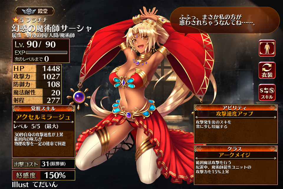 | プ ラ チ ナ | ![]() 幻惑の魔術師 サーシャ | メイジ | Lv1 | 889 | 563 | 58 | 20 | 260 | 31 | 28 | 攻撃力+180 射程+17 | 幻惑の秘術 | - | 編 集 |