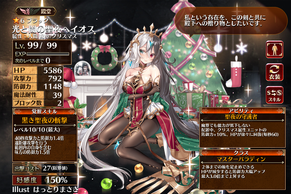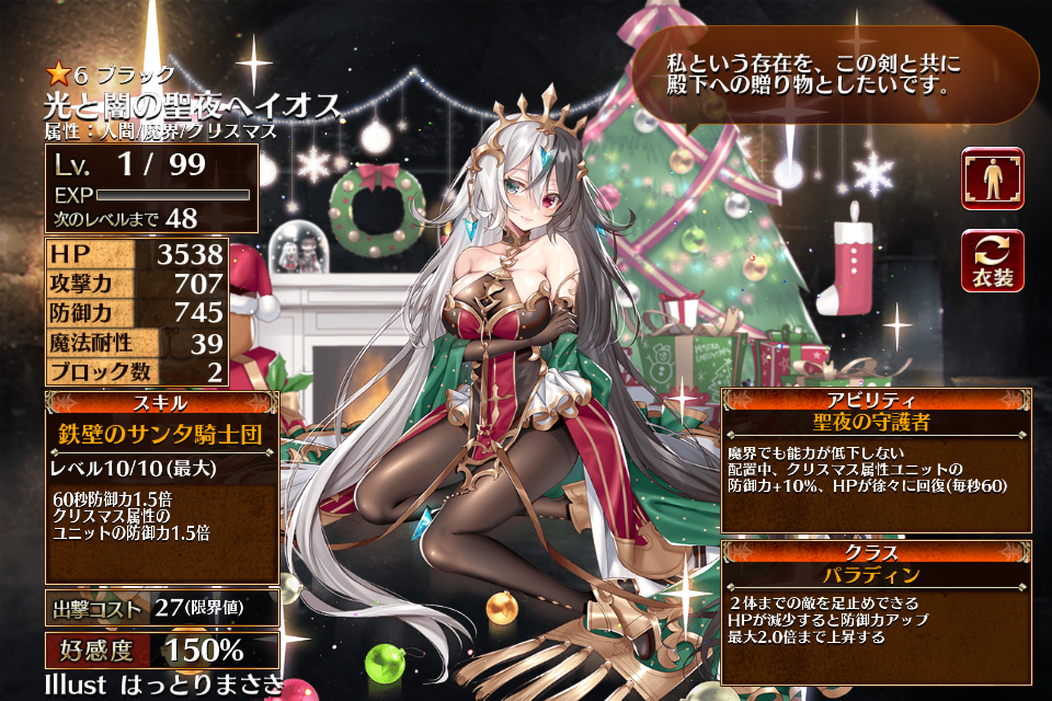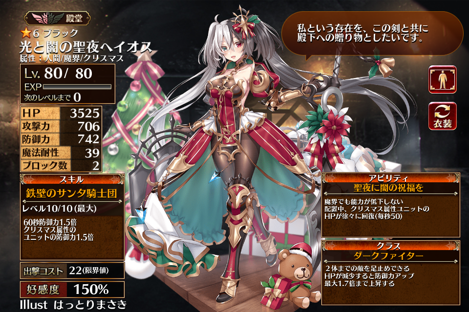 召喚枠黒ダークファイターである光闇の騎士ヘイオスのクリスマス衣装バージョンで、属性にも「クリスマス」を持つ。