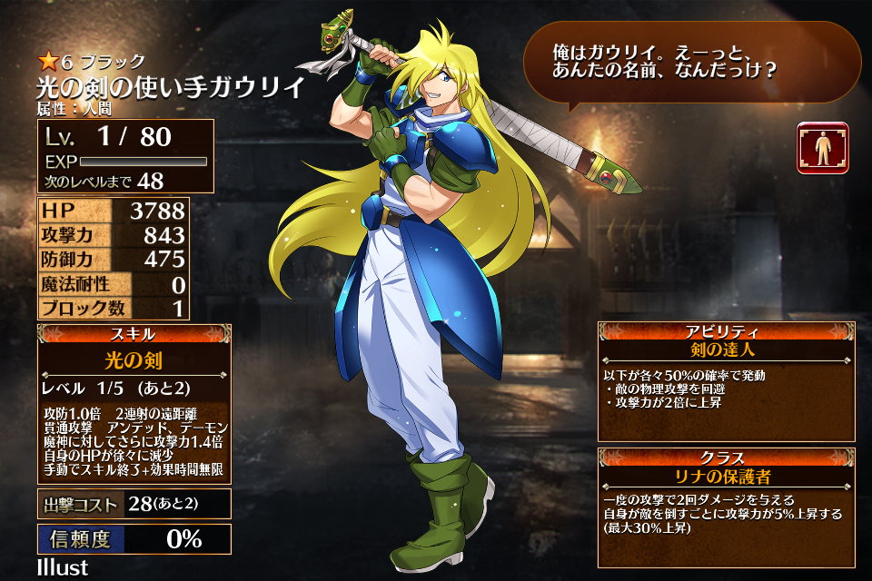 | 覚醒 | 烈光の剣 | 15秒攻防2.0倍 射程内の敵に直進し触れた敵全てにダメージを与える2連射の遠距離貫通攻撃 さらにアンデッド、デーモン、魔神に対して攻撃力2倍 | 初動まで5秒 | 回復まで50秒 |