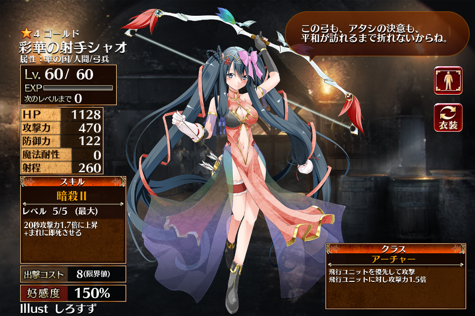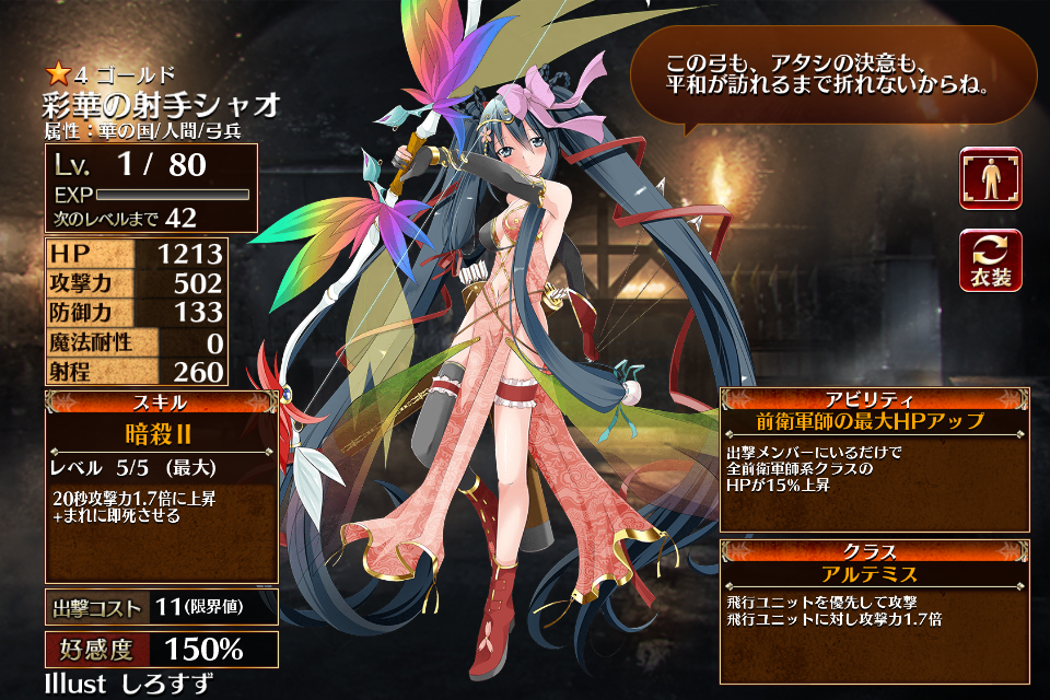 | アルテミス | Lv1 | 1213 | 370 | 133 | 0 | 260 | 16 | 11 | 攻撃力+132 物理攻撃回避+22% | 暗殺II ↓ ↑ 東方弓殺術 | 前衛軍師の最大HPアップ | |||