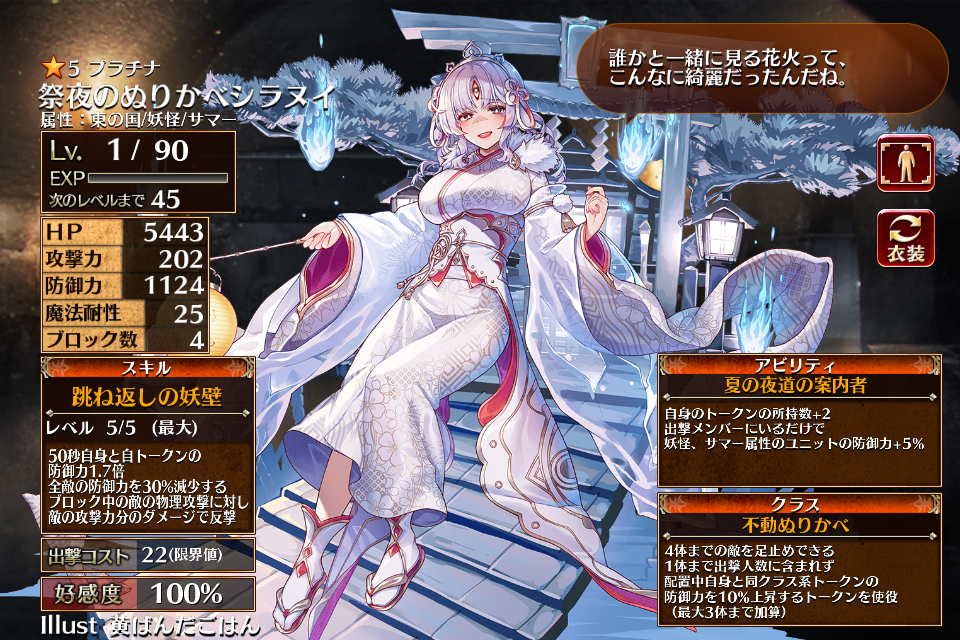 | 跳ね返しの妖壁 | Lv1 | 50秒自身と自トークンの防御力1.3倍 全敵の防御力を30%減少する ブロック中の敵の物理攻撃に対し敵攻撃力分のダメージで反撃 | 銀 | 金 | 青 | 22 | 黒 | 44 | 祭夜のぬりかべシラヌイ | 編 集 |