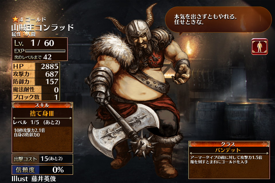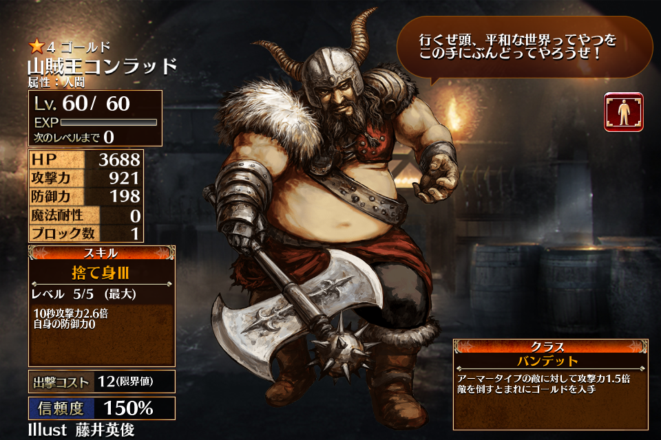| ゴ | ル ド | ![]() 山賊王コンラッド | バンデット | Lv1 | 2885 | 687 | 157 | 0 | 1 | 15 | 12 | 攻撃力+66 HP+250 | 捨て身III | - | 編 集 |