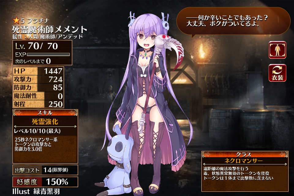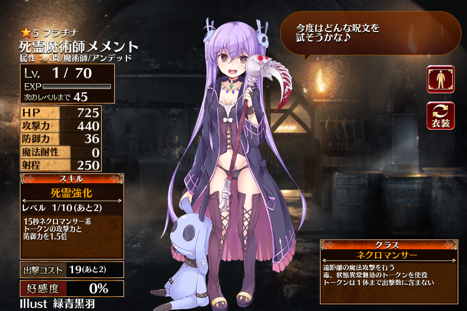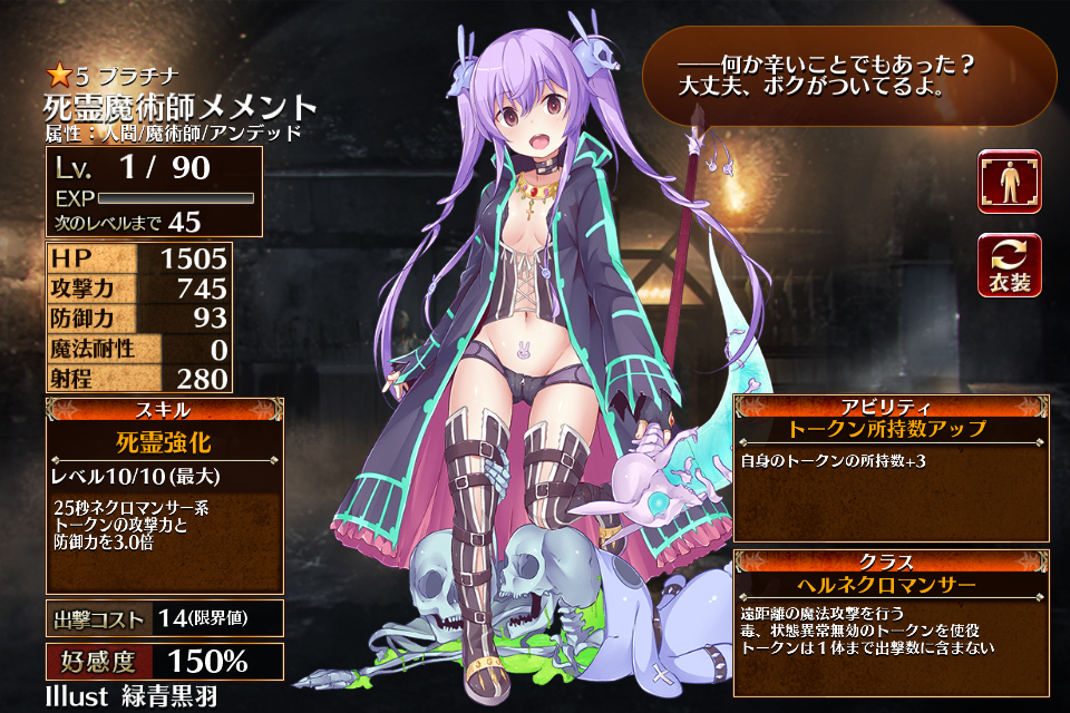 | 死霊強化 | Lv1 | 15秒ネクロマンサー系トークンの攻撃力と防御力を1.5倍 | - | - | - | 25 | - | 49 | 死霊魔術師メメント ちびメメント | 編 集 |