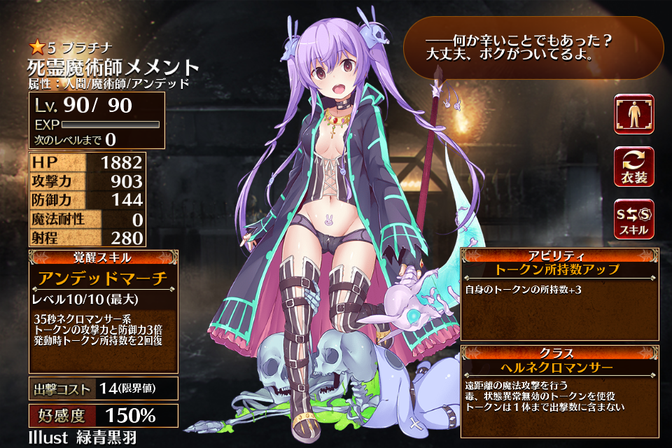 | ヘルネクロマンサー | Lv1 | 1145 | 601 | 93 | 0 | 280 | 19 | 14 | HP+360 攻撃力+144 スキル再使用時間-20% | 死霊強化 ↓ ↑ アンデッドマーチ | トークン所持数アップ | |||
