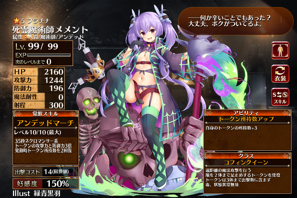 | 覚醒 | アンデッドマーチ | 35秒ネクロマンサー系トークンの攻撃力と防御力3倍 発動時トークン所持数を2回復 | 初動まで20秒 | 回復まで40秒 |