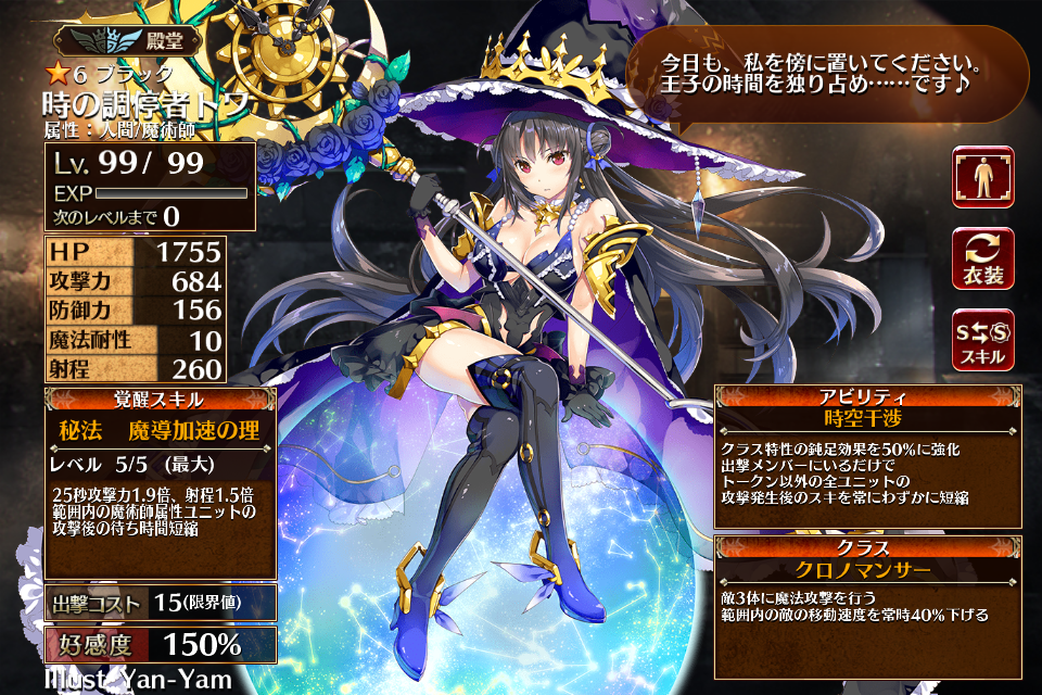 | Lv4 | 19秒攻撃力1.5倍、射程1.3倍 味方の全ウィッチ系および全クロノウィッチ系の攻撃後の待ち時間短縮 | - | - | - | - | 1 | 31 | |||